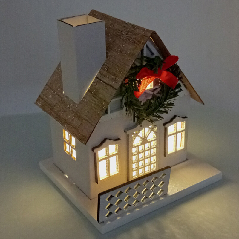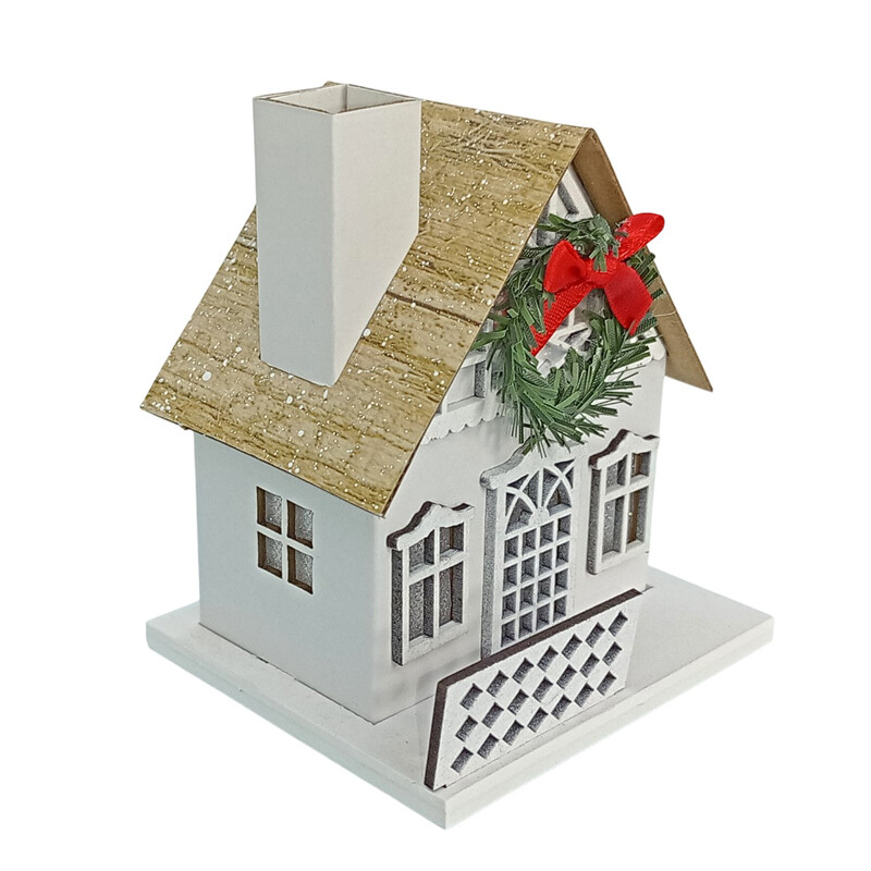 Joulutalo, jonka seinälle on joulukranssi. Sisällä LED-valo. Upea valaistus ja tunnelman luoja.