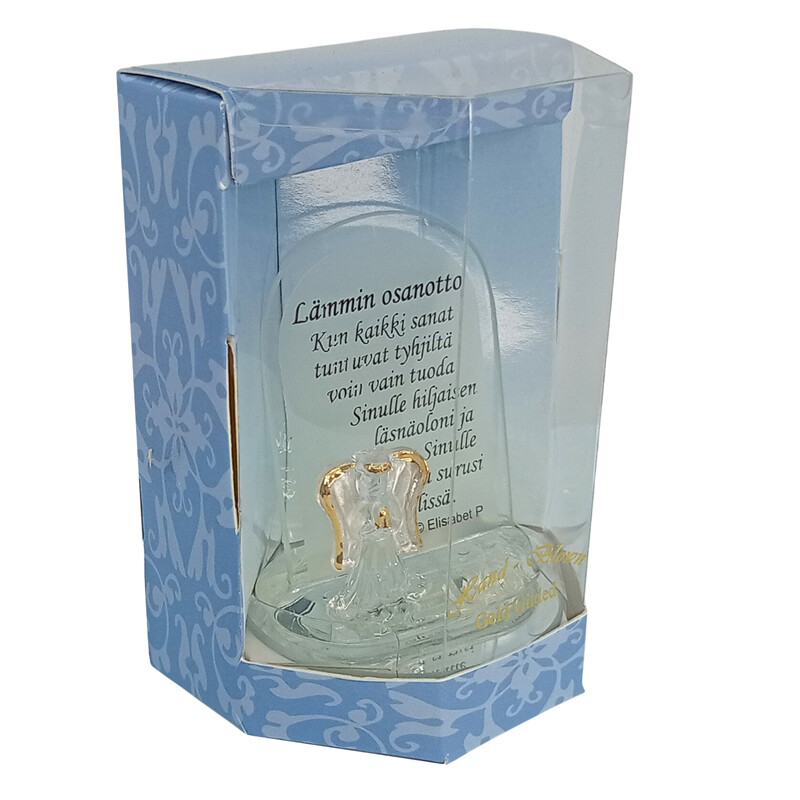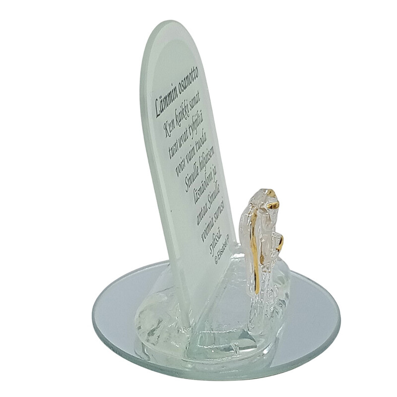 Yksilöllinen lahja tilanteeseen, jossa on vaikea löytää sanoja lohdutukseen. Pyöreän peilin päällä on kiinteänä lasienkeli ja taulu, jossa on tekstinä: