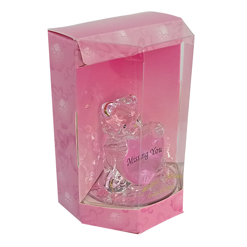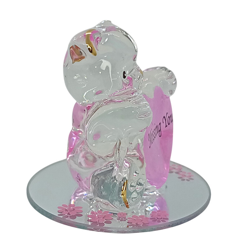 Missing You - lasinalle Code: KM1900 Description Suloinen ja sileäpintainen lasinalle pitelee sylin täydeltä lasista sydäntä, jossa lukee "Missing You". Nalle on kiinteästi pyöreän peilin päällä. Nallessa kultauskoristeet Korkeus 6 cm Läpinäkyvä lahjapakkaus