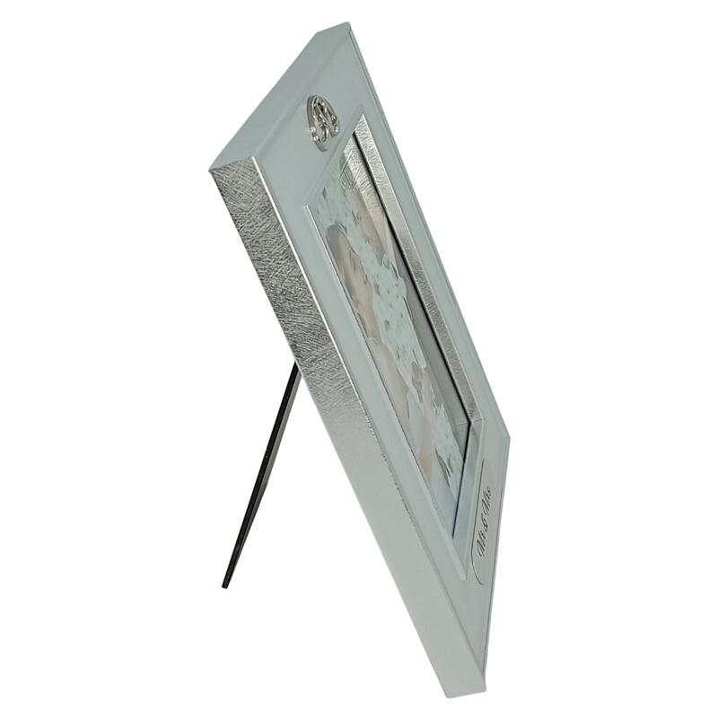 Tyylikäs hääkehys. Kehyksen yläreunassa on kaksi sormusta, jossa on zirkon-kivi. Mr & Mrs -tekstilaata on alareunassa.