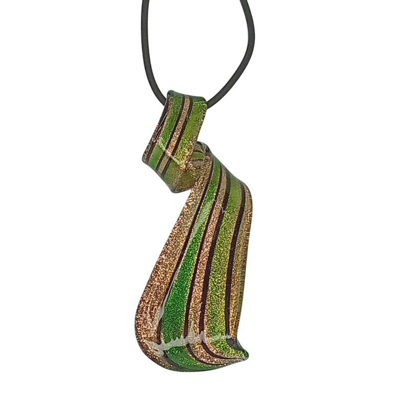 Lasinen kaulakoru, jossa väritys on kullan- ja vihreänvärinen. Kaulakorussa on tekstiilinauha ja metallinen lukitus jatkopalalla.