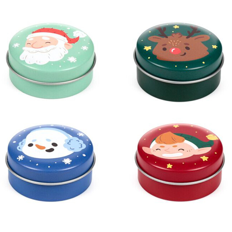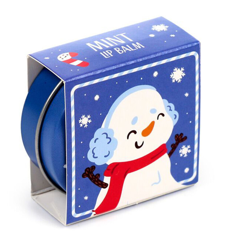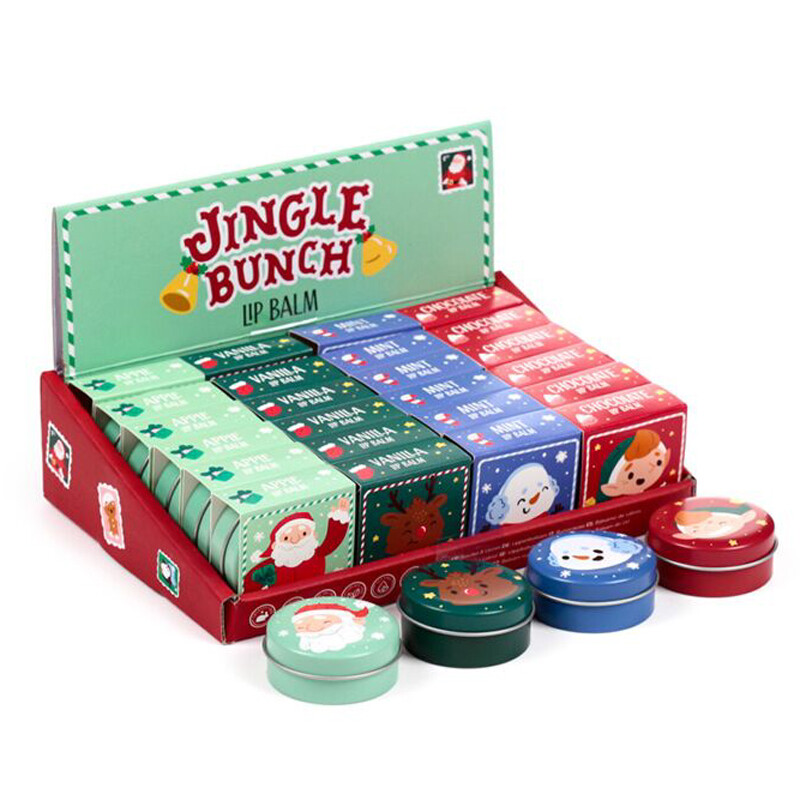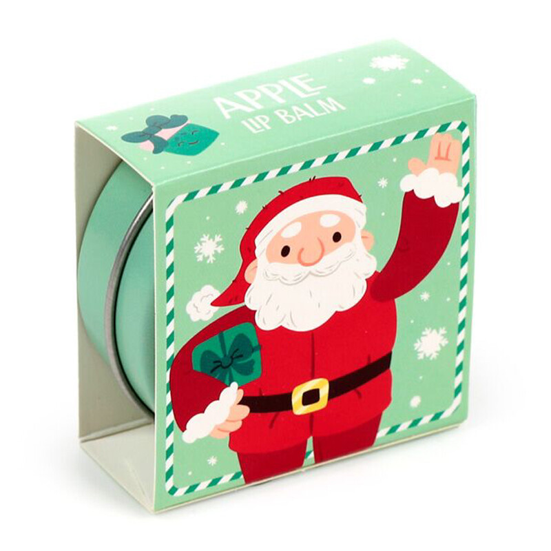 Hyväntuoksuinen ja -makuinen huulirasva peltirasiassa. Rasian kannessa on jouluaiheisia kuvia. Neljä kuvaa ja neljä makua: omena, vanilja, minttu ja suklaa.