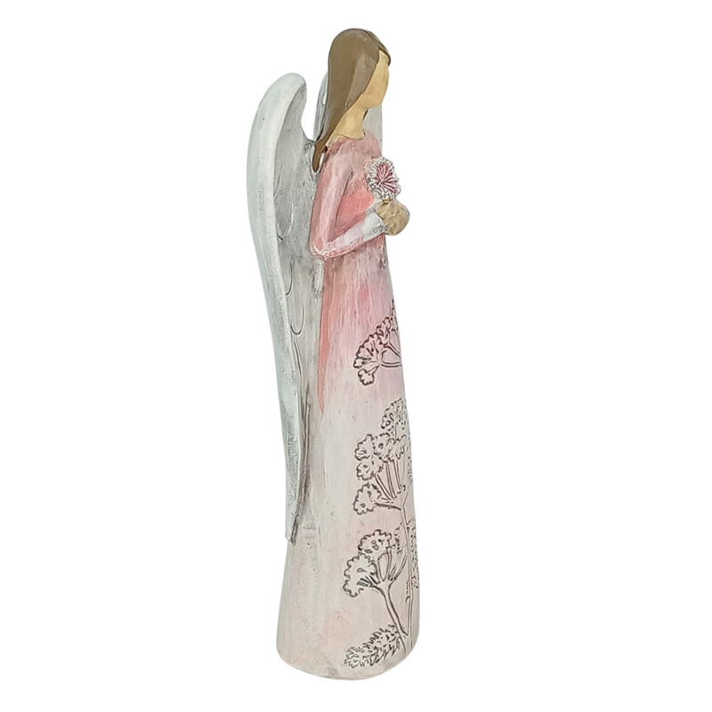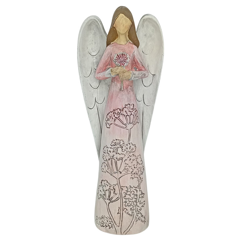 Kaunis, seisova enkeli kukkakuviomekossaan ja kukka käsissään.