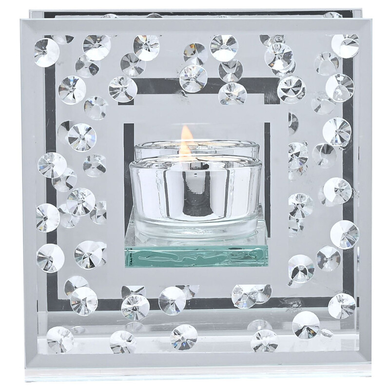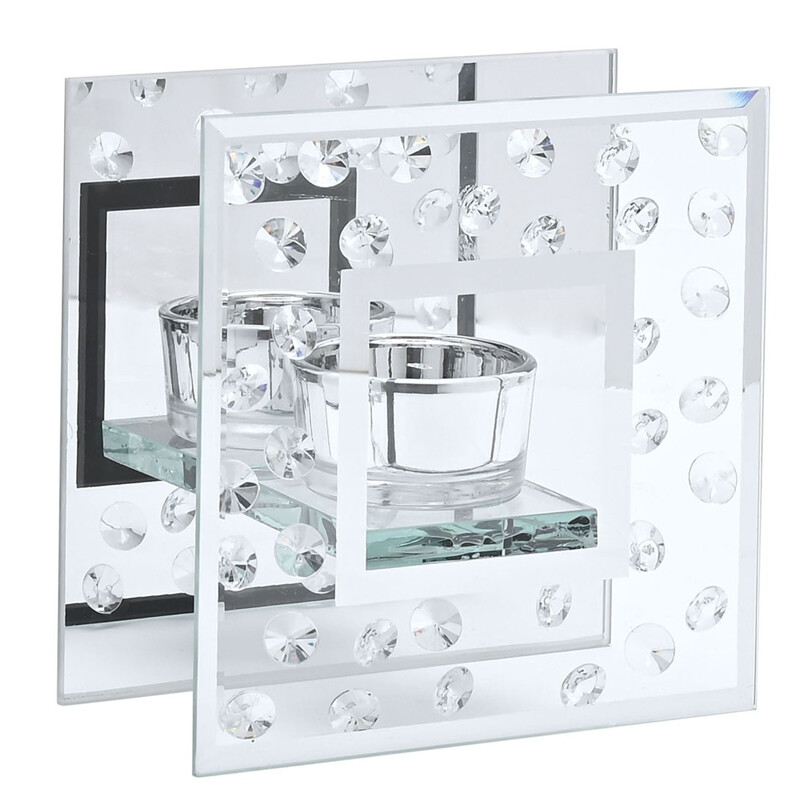 Lasinen tuikkualunen, jonka etusivulla on pieniä lasitimantteja. Takaseinä on peililasia. Lasinen kiinteä tila tuikulle. Antaa kauniin, tunnelmallisen valon.