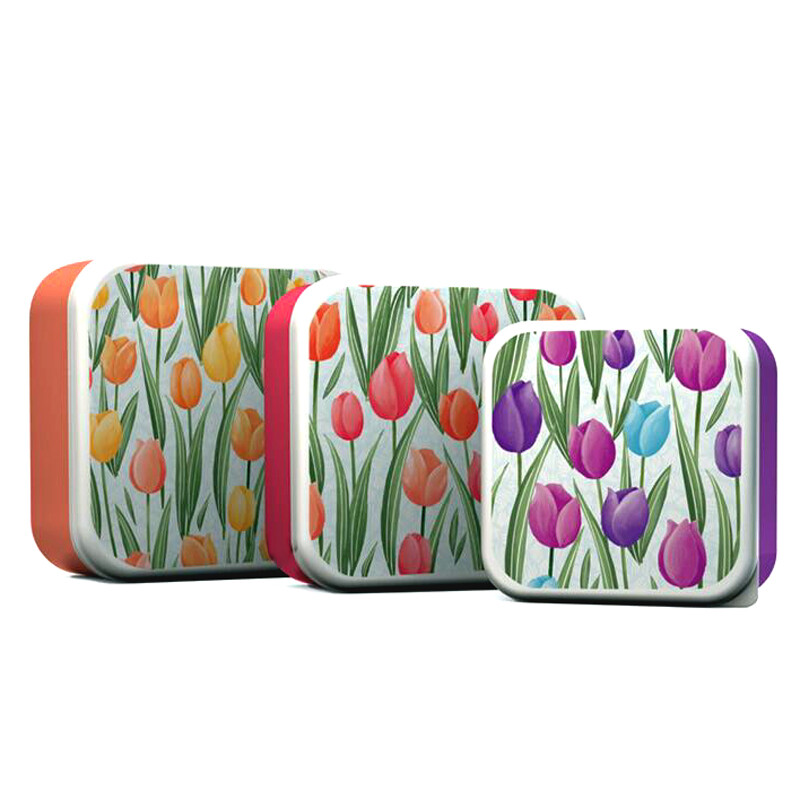 Kolmen eväsrasian sarja. Rasiat ovat erikoisia, ja jokaisessa on oma tulppaanikuvituksensa. Rasiat menevät sisäkkäin suurimman rasian sisään.