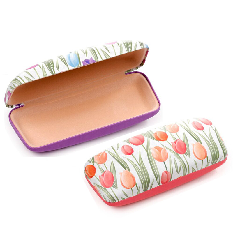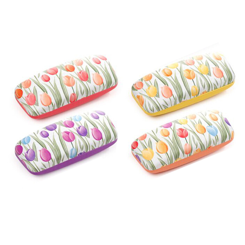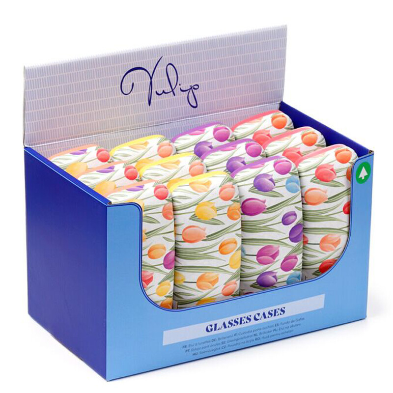 Kovarunkoinen silmälasikotelo. Pehmustettu sisäpinta. Kuvituksena tulppaaneja. Neljä erilaista kuvaa. Kun tilaat 12 kappaletta, niin silmälasikotelot tulevat myyntitelineessä.