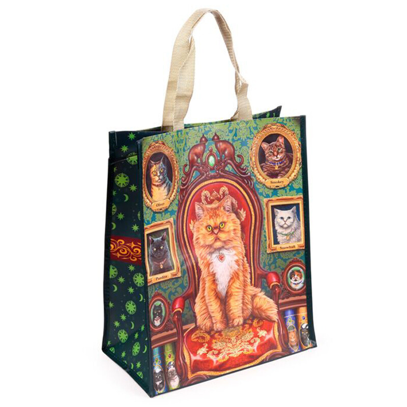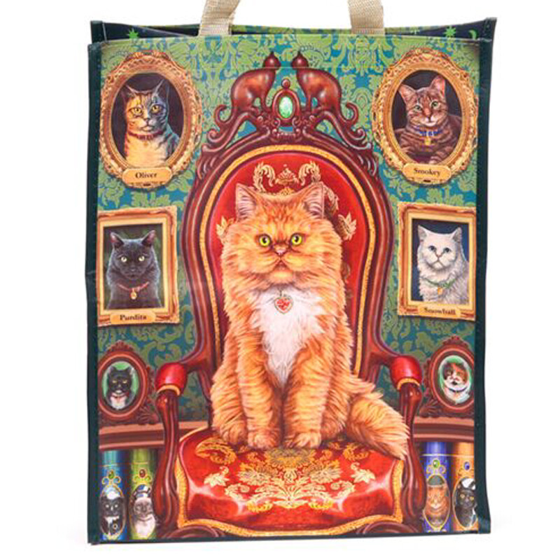 Kestävä kassi, jonka kuvassa on tyytyväisenoloinen Ginger-kissa kissakuvien ympäröimänä. Materiaali on kestävää ja sitä voi puhdistaa kostealla pyyhkimällä. Kassin pohjassa on levikekappale, joten kassiin sopii reilusti tavaraa. Valmistettu 100% kierrätysmateriaalista ja kosteussuojattu.