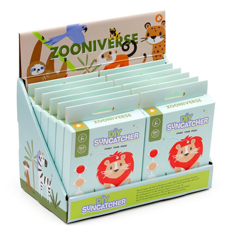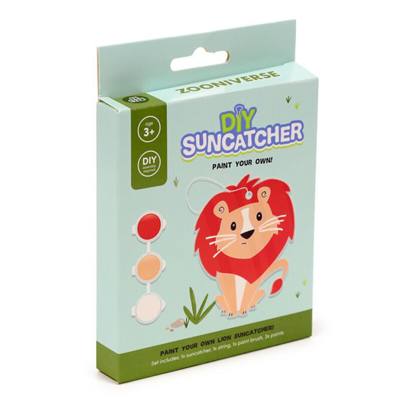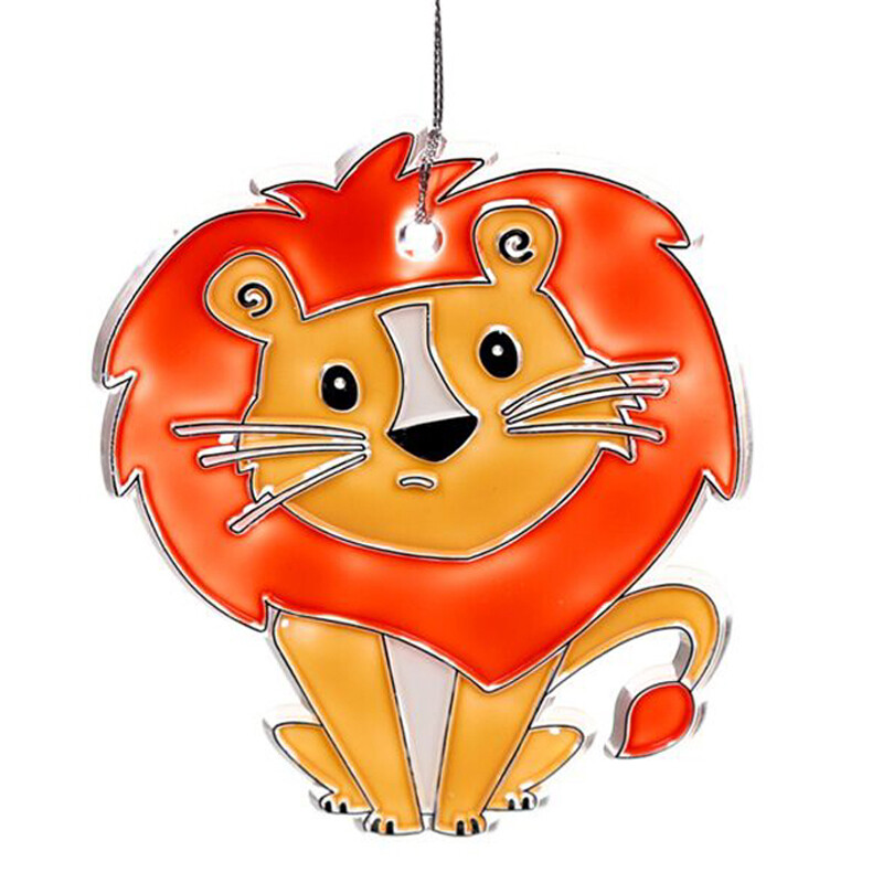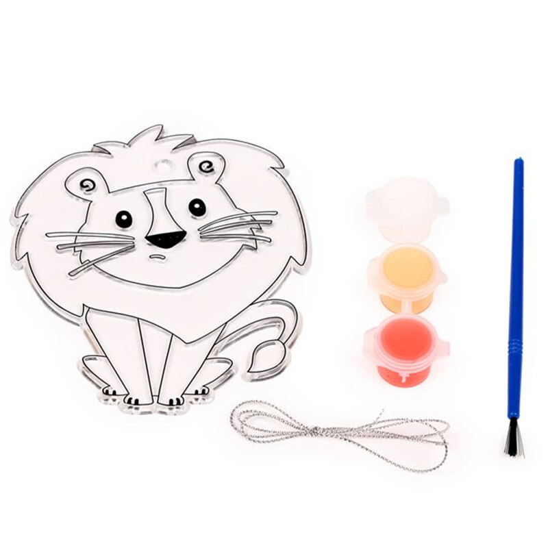 Voit tehdä oman leijona-aiheisen, tiffanytyylisen lasiriipuksen "rakennussarjan" avulla. Pakkauksessa on muotoon leikattu kirkas levy, kolme eriväristä vesiväripurkkia, pensseli ja ripustusnauha. Hauska askartelu lapsille tai miksei aikuisillekin.