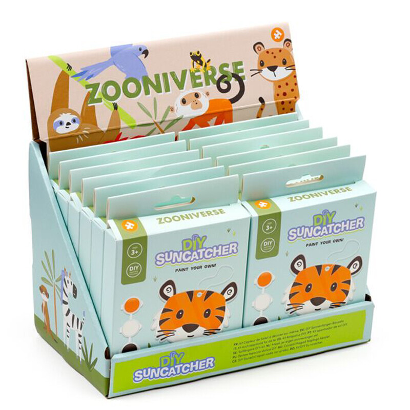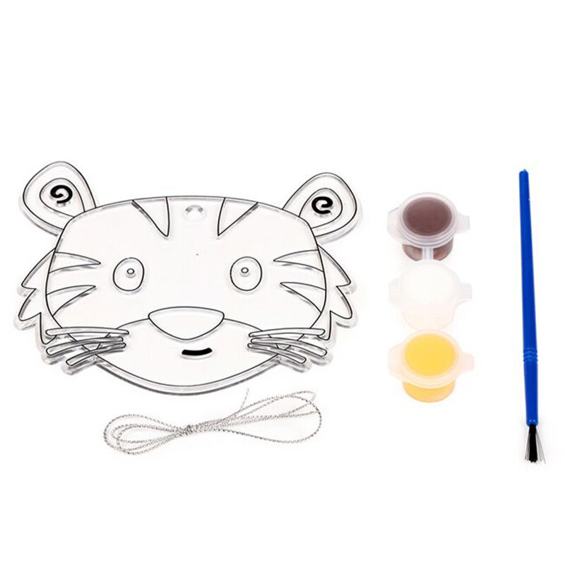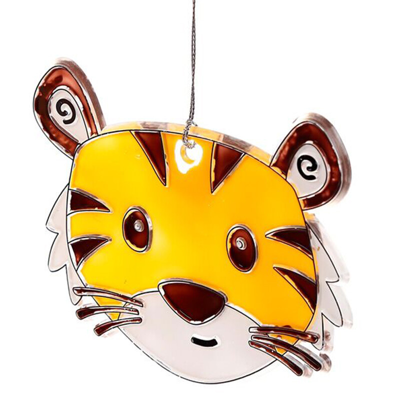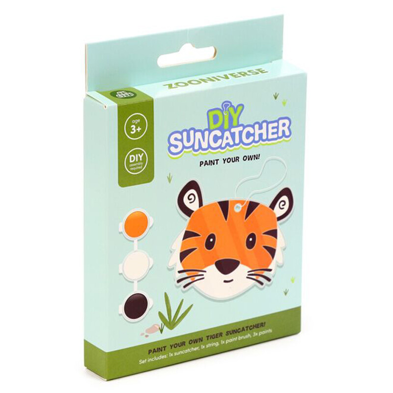 Voit tehdä oman tiikeri-aiheisen, tiffanytyylisen lasiriipuksen "rakennussarjan" avulla. Pakkauksessa on muotoon leikattu kirkas levy, kolme eriväristä vesiväripurkkia, pensseli ja ripustusnauha. Hauska askartelu lapsille tai miksei aikuisillekin.