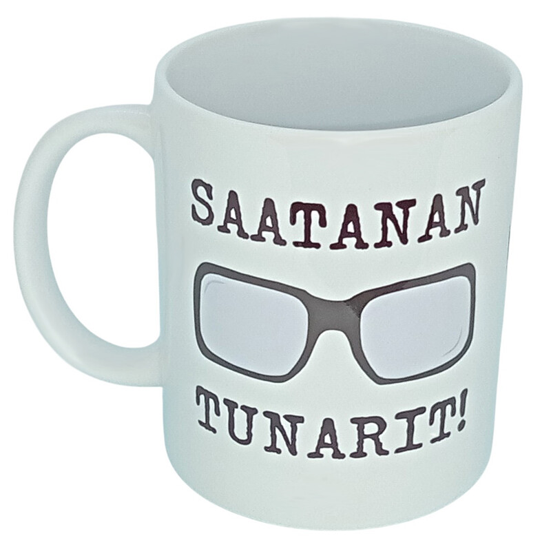 Tekstimuki - Saatanan tunarit Koodi: KM2159 Kuvaus Yksi Kekkosen tunnetuimmista lausahduksista. "Retro-muki" -mallisto Korkeus 9,5 cm Tilavuus noin 3 dl Lasitettua posliinia Konepesun ja mikron kestävä Lahjapakkaus suomenkielisin tekstein