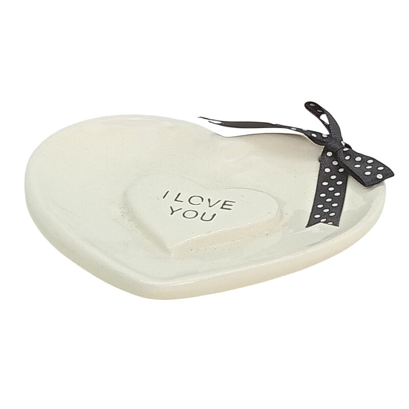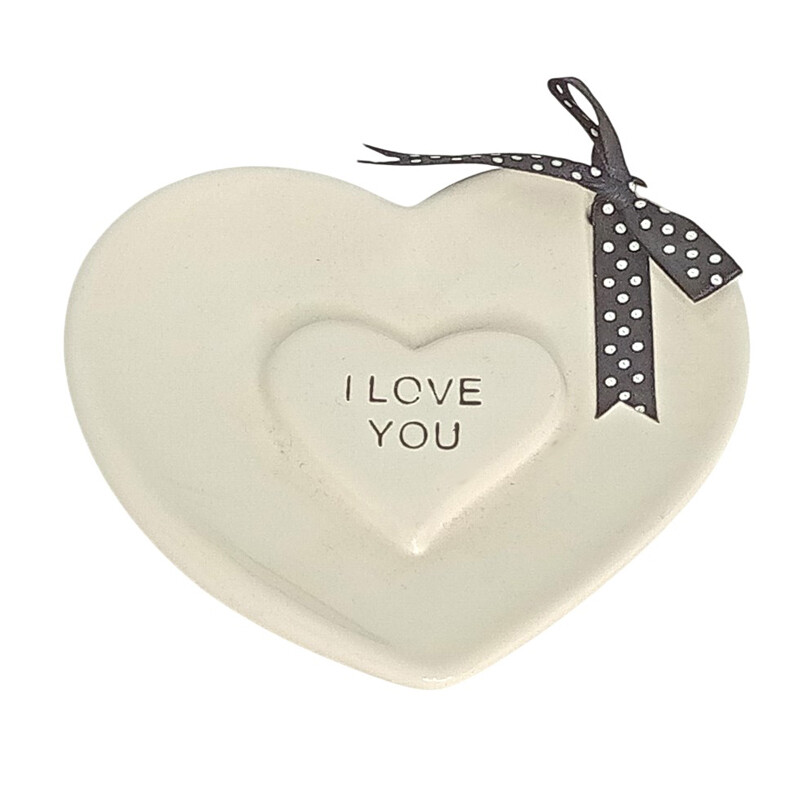 Sydämen muotoinen, lasitettu, keraaminen vati. Keskellä vatia kohotettu sydän, jossa lukee tekstit I LOVE YOU. Lisäsomisteena on pilkullinen tekstiilirusetti.