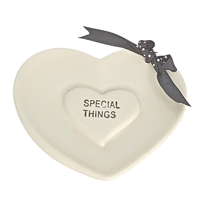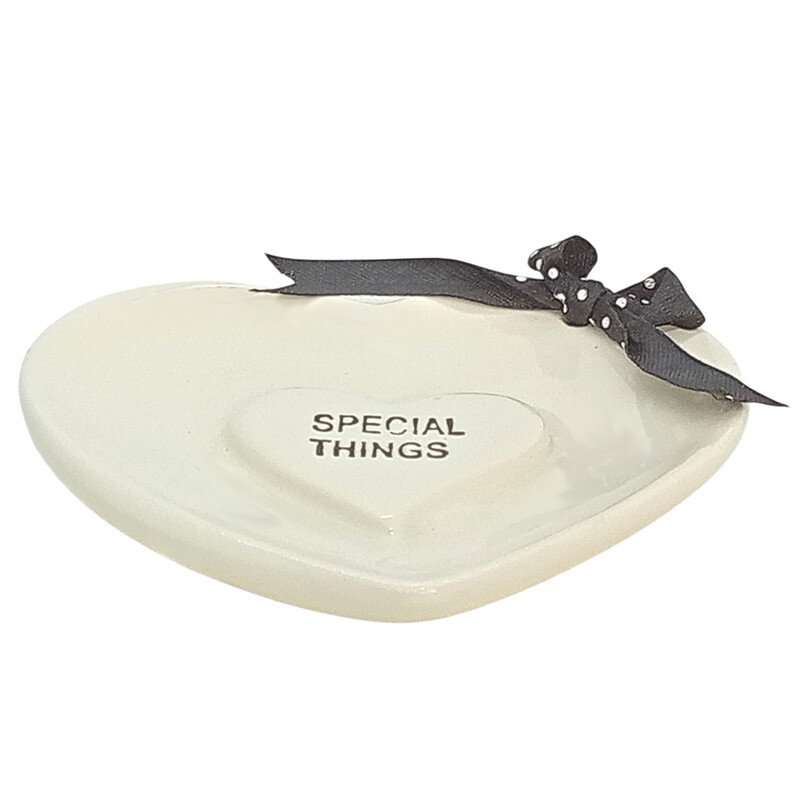 Sydämen muotoinen, lasitettu, keraaminen vati. Keskellä vatia kohotettu sydän, jossa lukee tekstit SPECIAL THINGS. Lisäsomisteena on pilkullinen tekstiilirusetti.