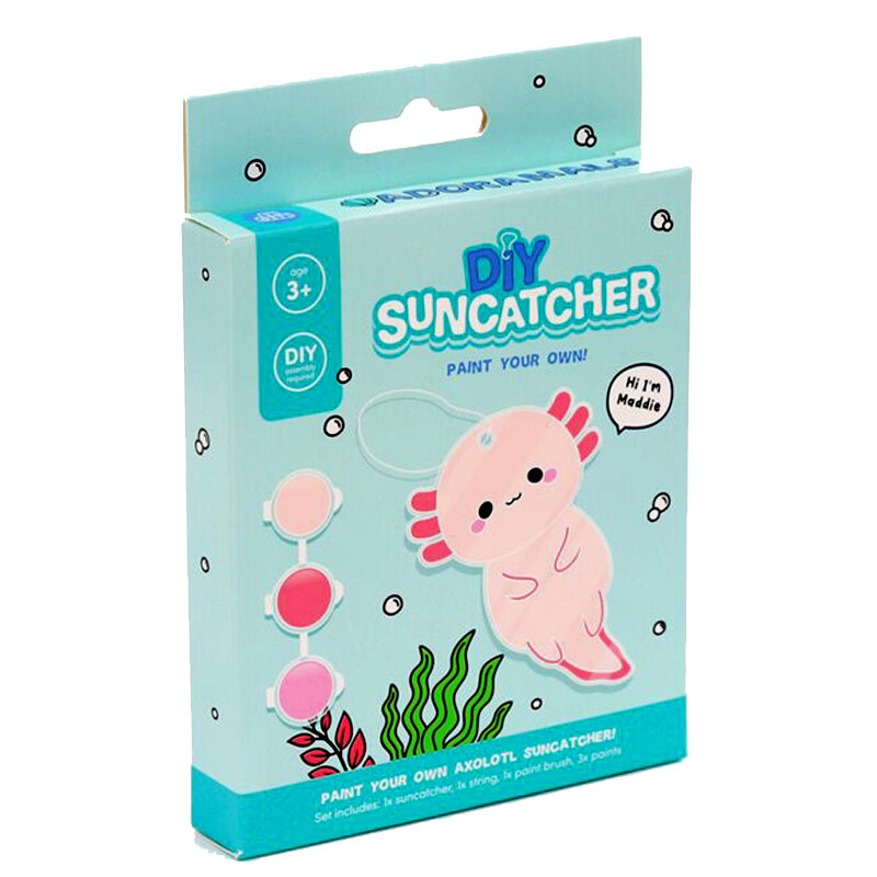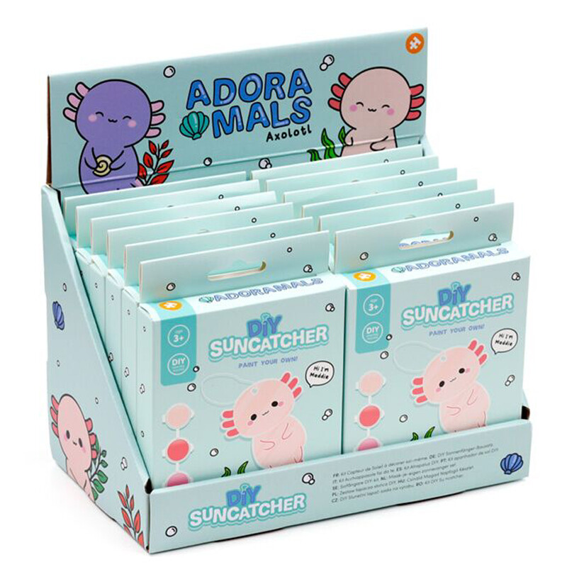Voit tehdä oman Adoramals-hahmoisen, tiffanytyylisen lasiriipuksen "rakennussarjan" avulla. Pakkauksessa on muotoon leikattu kirkas levy, kolme eriväristä vesiväripurkkia, pensseli ja ripustusnauha. Hauska askartelu lapsille tai miksei aikuisillekin.