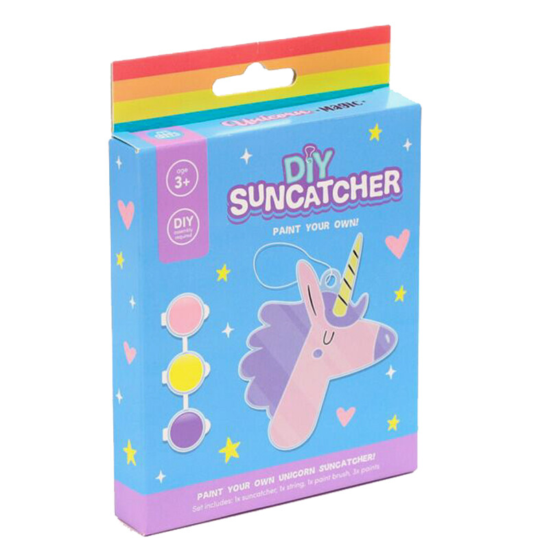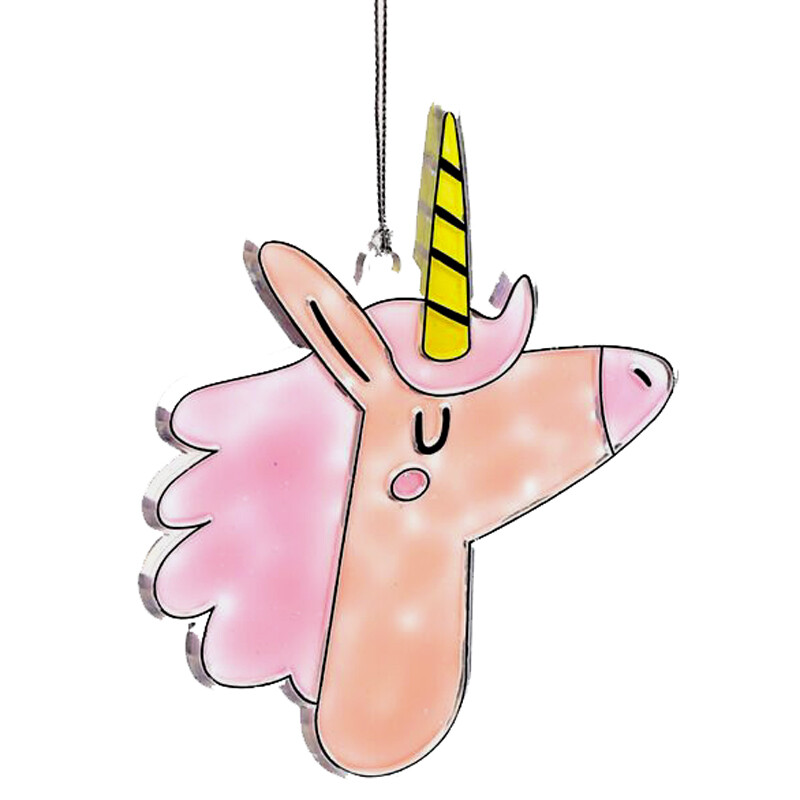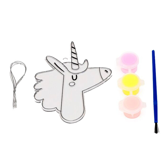 Voit tehdä oman yksisarvis-aiheisen, tiffanytyylisen lasiriipuksen "rakennussarjan" avulla. Pakkauksessa on muotoon leikattu kirkas levy, kolme eriväristä vesiväripurkkia, pensseli ja ripustusnauha. Hauska askartelu lapsille tai miksei aikuisillekin.
