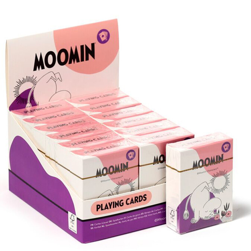 Muumi-aiheiset pelikortit. Kuvakorteissa on Muumi-kuvat. Myyntierässä on 12 korttipakkaa, jotka tulevat myyntitelineessä.