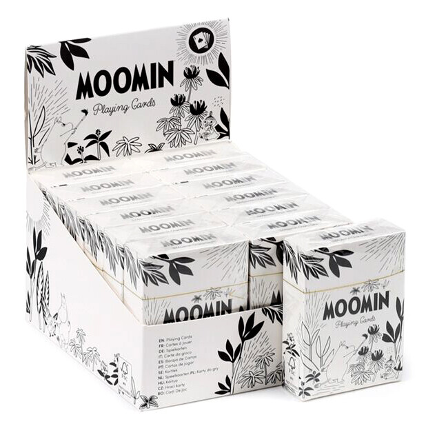 Muumi-aiheiset pelikortit. Kuvakorteissa on Muumi-kuvat. Myyntierässä on 12 korttipakkaa, jotka tulevat myyntitelineessä.