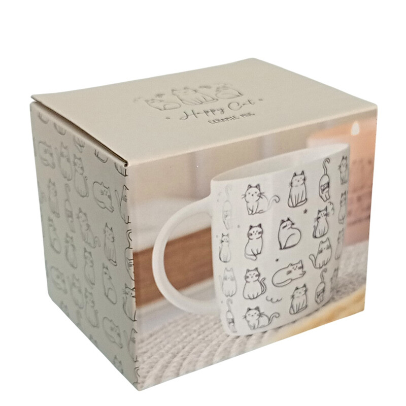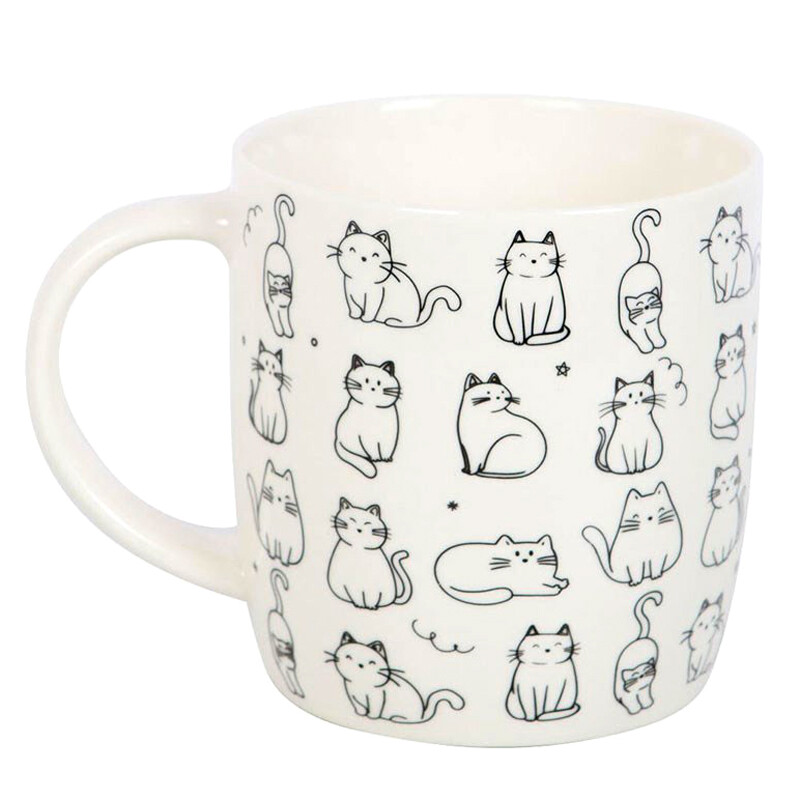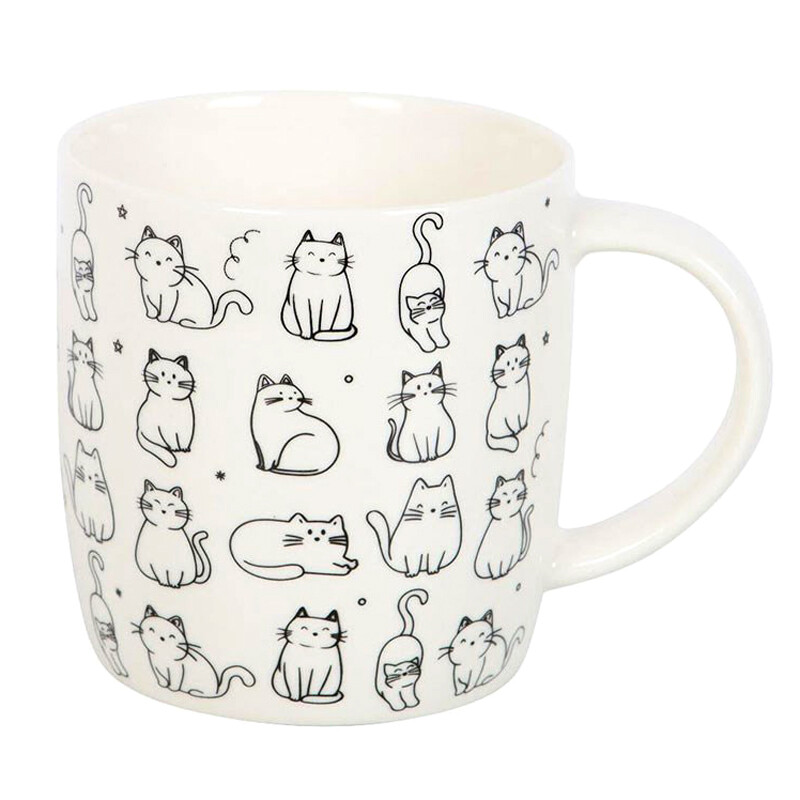 Tasokas posliinimuki, jossa runsaasti piirrettyjä kissan kuvia.