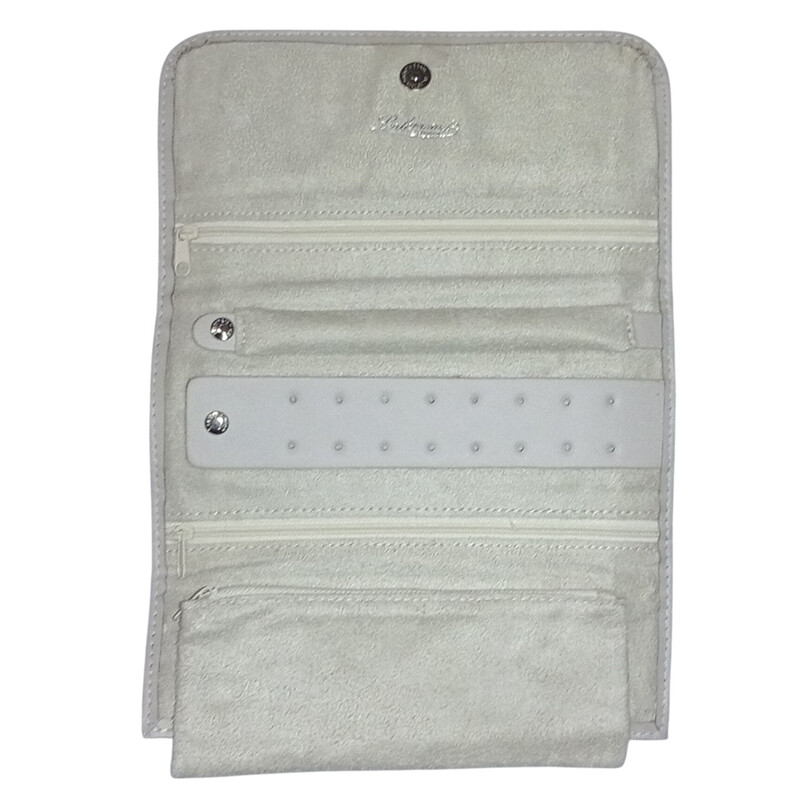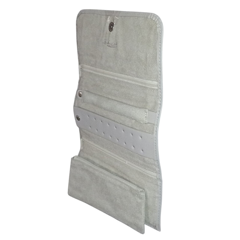 Käytännöllinen ja kevyt korulaukku, joka on helppo ottaa myös matkalle mukaan. Tasokas mokkanahkamainen sisäpuoli on miellyttävä käsitellä. Kolme vetoketjullista taskua. Säilytystila kahdeksalle korvakoruparille.