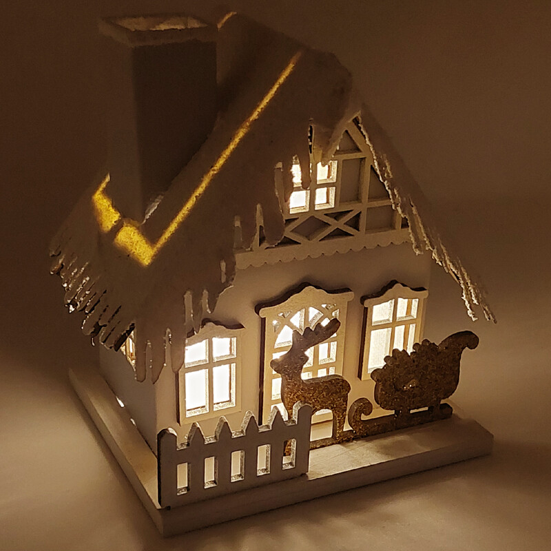 Joulutalo. "Luminen" katto. Poro ja reki talon edessä. Sisällä LED-valo. Upea valaistus ja tunnelman luoja.