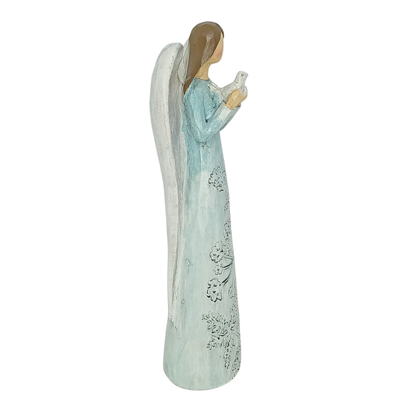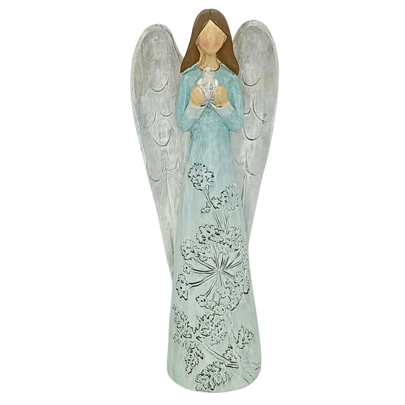 Kukkaenkeli 21 cm Aqua Code: JD336290 Description Kaunis, seisova enkeli kukkakuviomekossaan ja lintu käsissään. Väri: Aqua (vedensininen) Materiaali resin Korkeus noin 21 cm