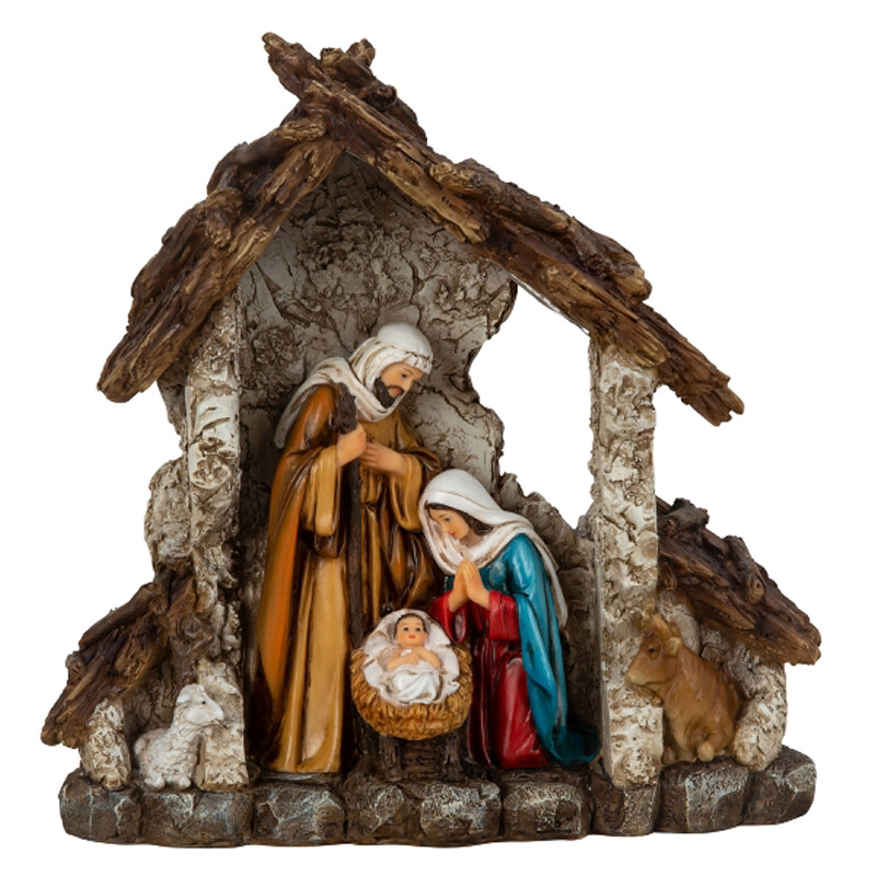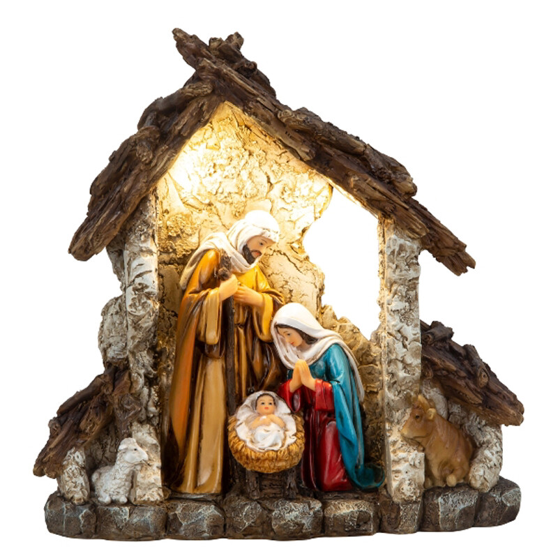 Perinteinen, kiinteä seimiasetelma. Jeesus-lapsi, Maria, Josef ja eläimet. Tallin katon sisäpinnalla on kaksi LED-valoa.