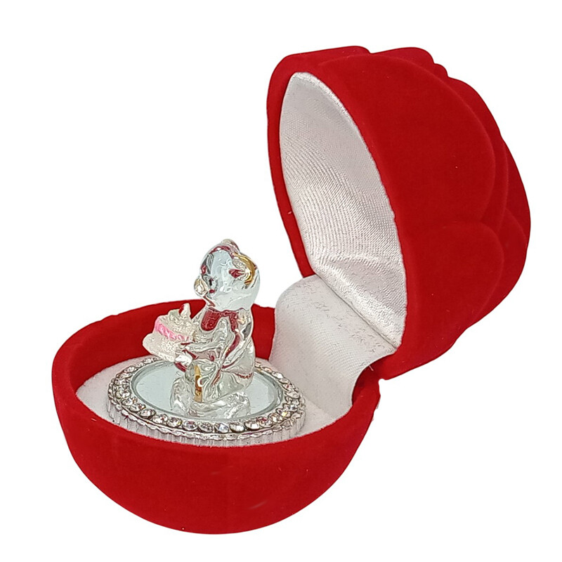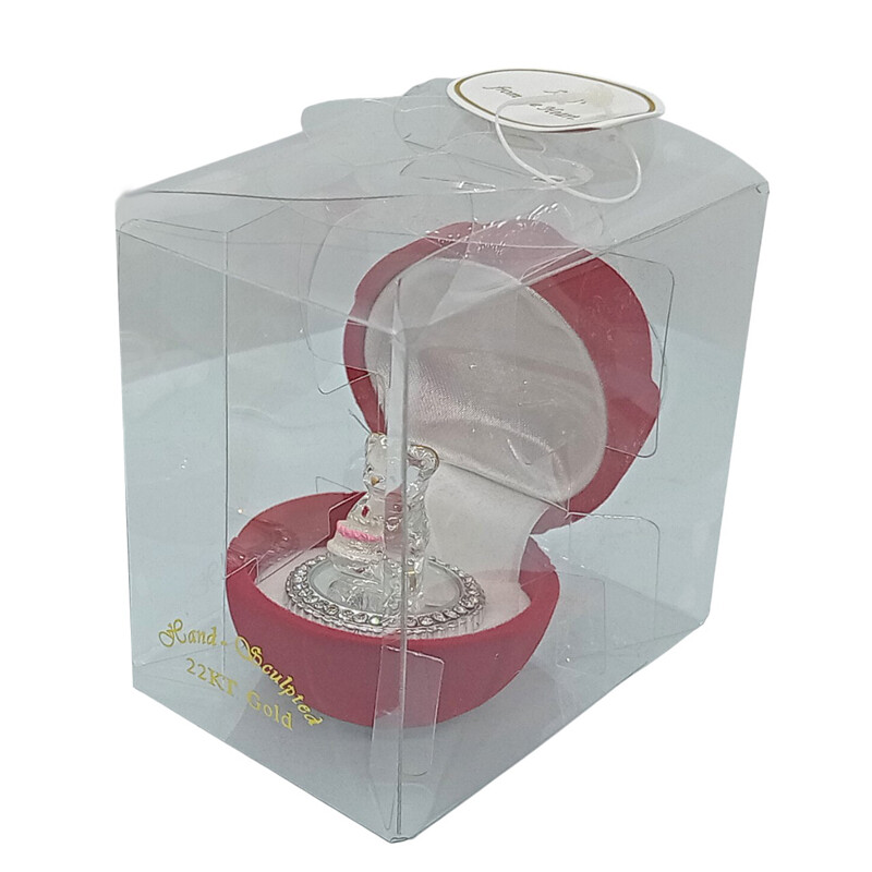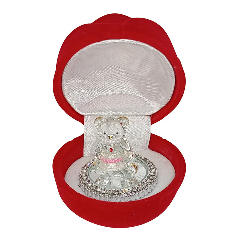 Lasinalle ruusurasiassa* Code: KM1746 Description Veikeä lasinalle täytekakku sylissä. Rasia, jossa nalle istuu on ruusunmuotoinen punainen samettirasia saranoilla. Kokonaisuus on vielä pakattu läpinäkyvään ja tukevaan myyntipakkaukseen. Nallen korkeus 4 cm 22k kultaus Kaunis samettirasia