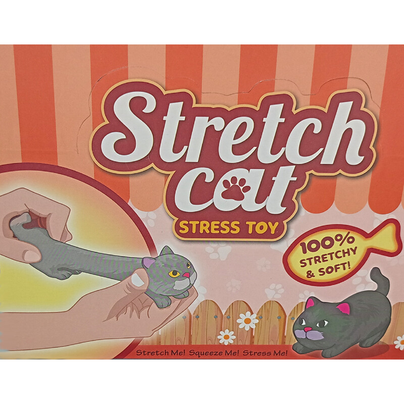 Suosittu stressilelu. Kissa on joustavaa kumia, joten voit puristella ja venyttää kissaa lähes mielin määrin. Lelut tulevat laatikossa, joka toimii myyntitelineenä.