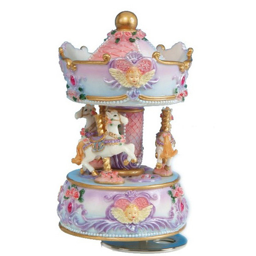 Lilasävyinen kerubikuvioin somistettu tivolikaruselli-soittorasia, jossa koko karuselli pyörii musiikin soidessa
