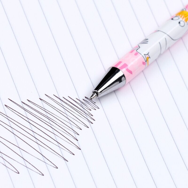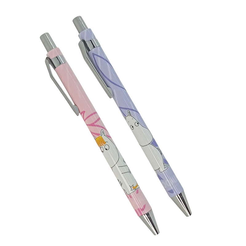 Kahden kuulakärkikynän pakkaus. Kuvissa Muumipeikko ja Niiskuneiti. Kirjoittaa erittäin pehmeästi.