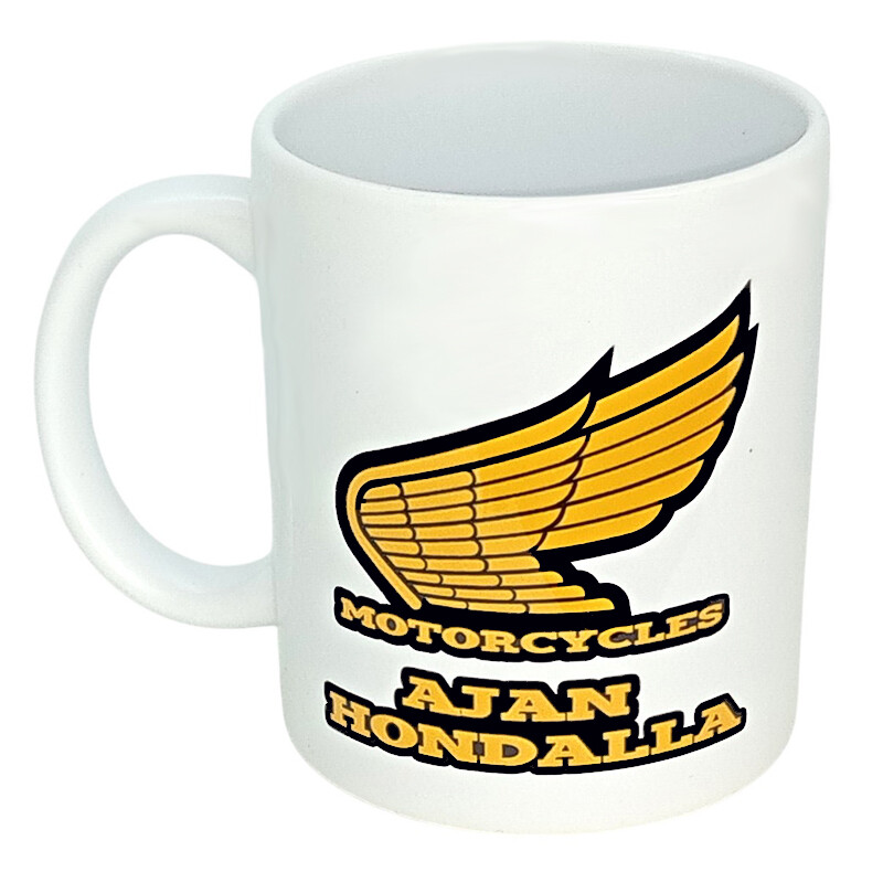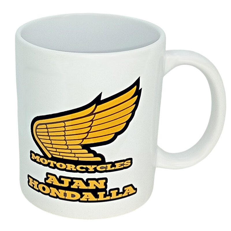 UUSI Ajan Hondalla -muki Code: KM2265 Description Muki prätkän mukaisesti! "Retro-muki" -mallisto Korkeus 9,5 cm Tilavuus noin 3 dl Lasitettua posliinia Konepesun ja mikron kestävä Lahjapakkaus suomenkielisin tekstein