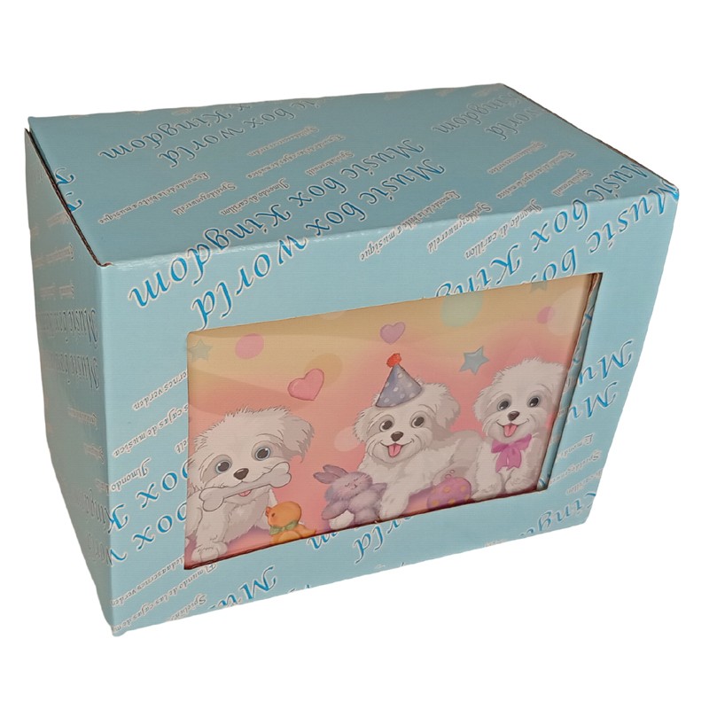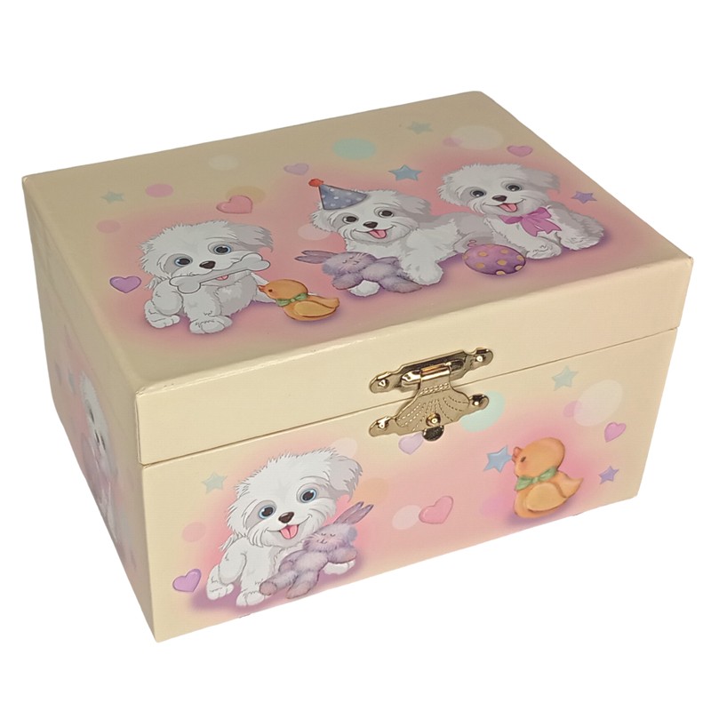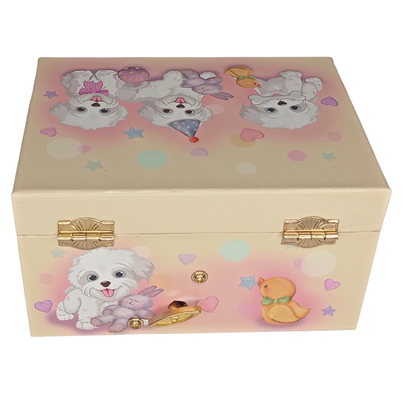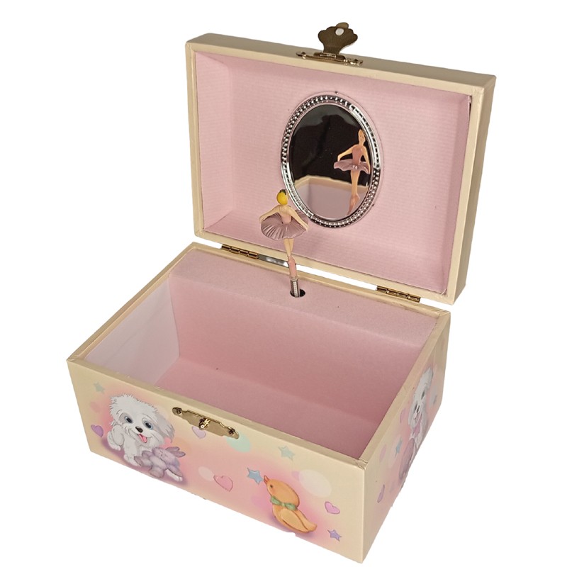 Korurasia, joka on myös soittorasia. Kansikuvassa koiranpentuja. Sisäpinnoiltaan rasia on pehmustettu pinkillä tekstiilillä. Kannen sisäpinnalla on 7 cm korkea ovaali peili, jonka edessä balleriina tanssii musiikin soidessa.