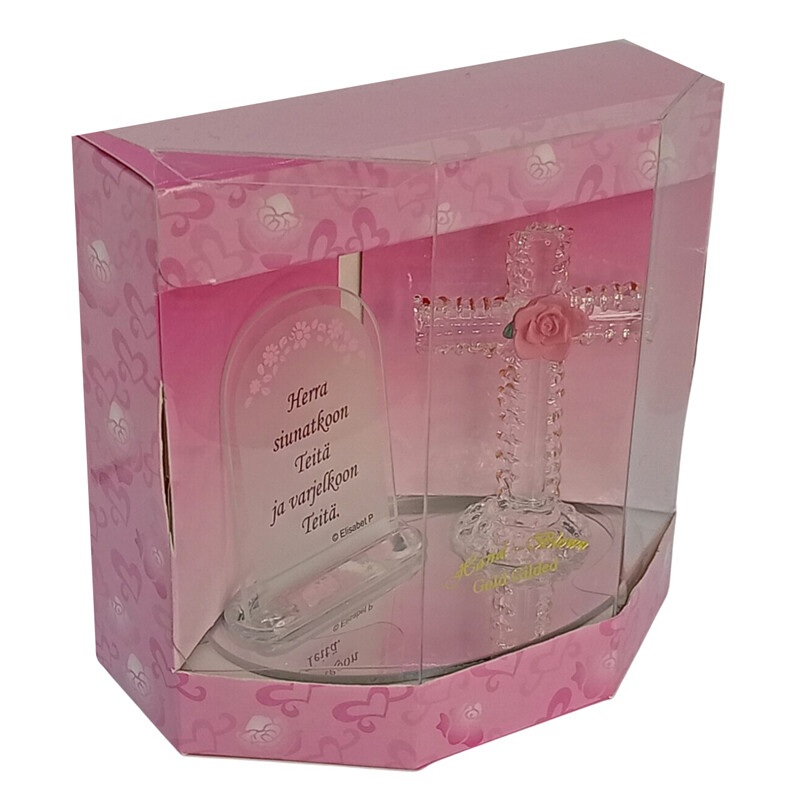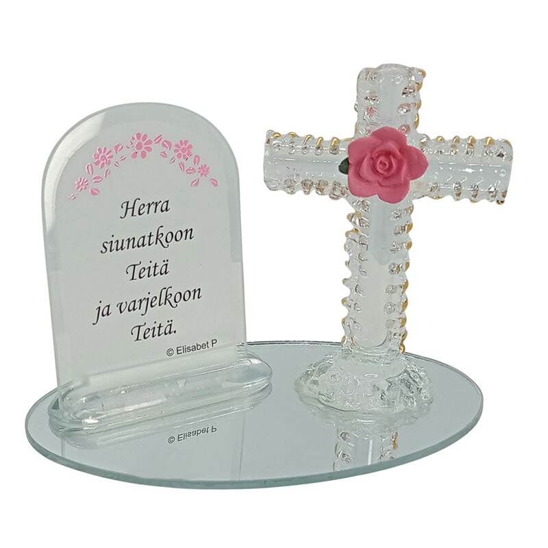 Ovaalin peilin päällä kiinteästi oleva lasiristi, jonka vierellä on lasitaulu, jossa "Herra siunaus" -teksti: "Herra siunatkoon Teitä ja varjelkoon Teitä.."