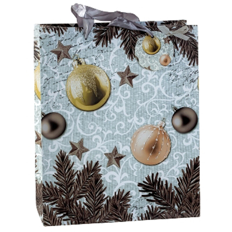 Kätevän kokoinen kassi joululahjoille. Kuvassa joulukuusen koristeita. Myyntierässä on vaalean ja tummemman sävyisiä kasseja. Joulukassi.