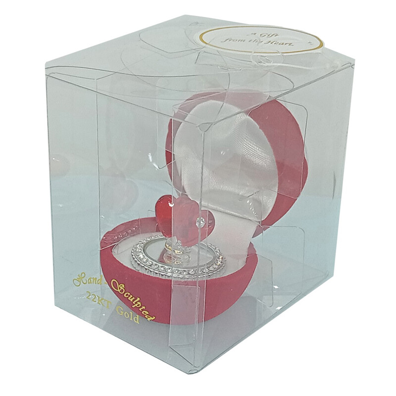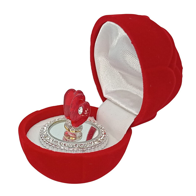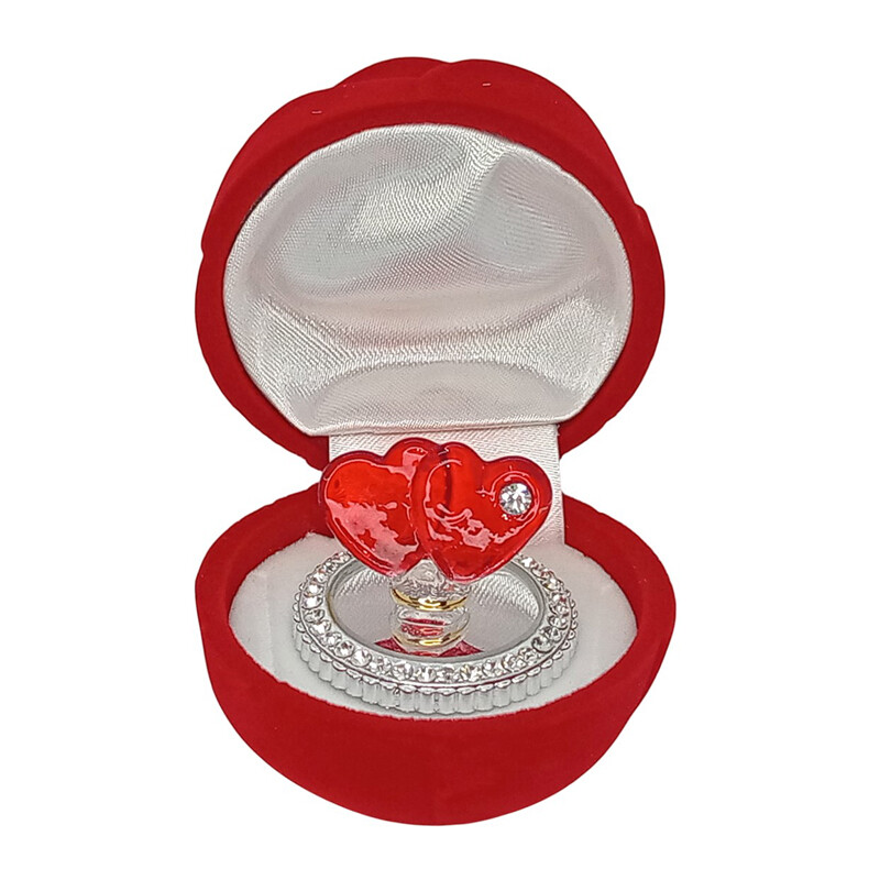 Samettisessa ruusunmuotoisessa rasiassa on kaksi toisissaan kiinni olevaa lasisydäntä. Toisen sydämen reunlla on zirkontimantti.
