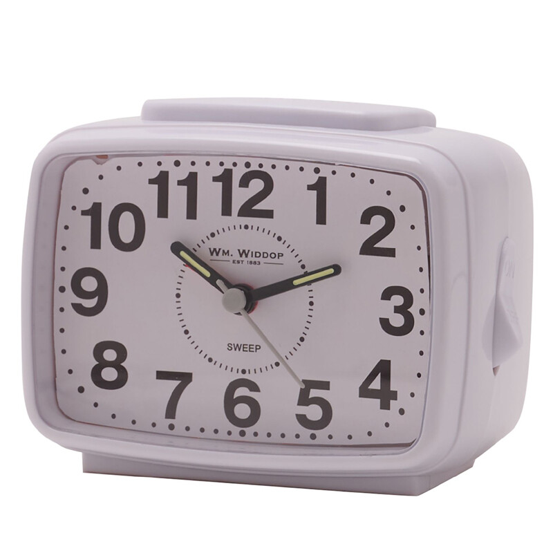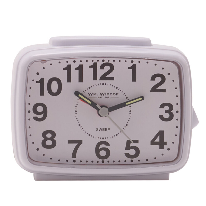 Tyylikäs herätyskello "äänettömällä" -koneistolla. Selkeät, isot numerot. Muovirunkoinen.